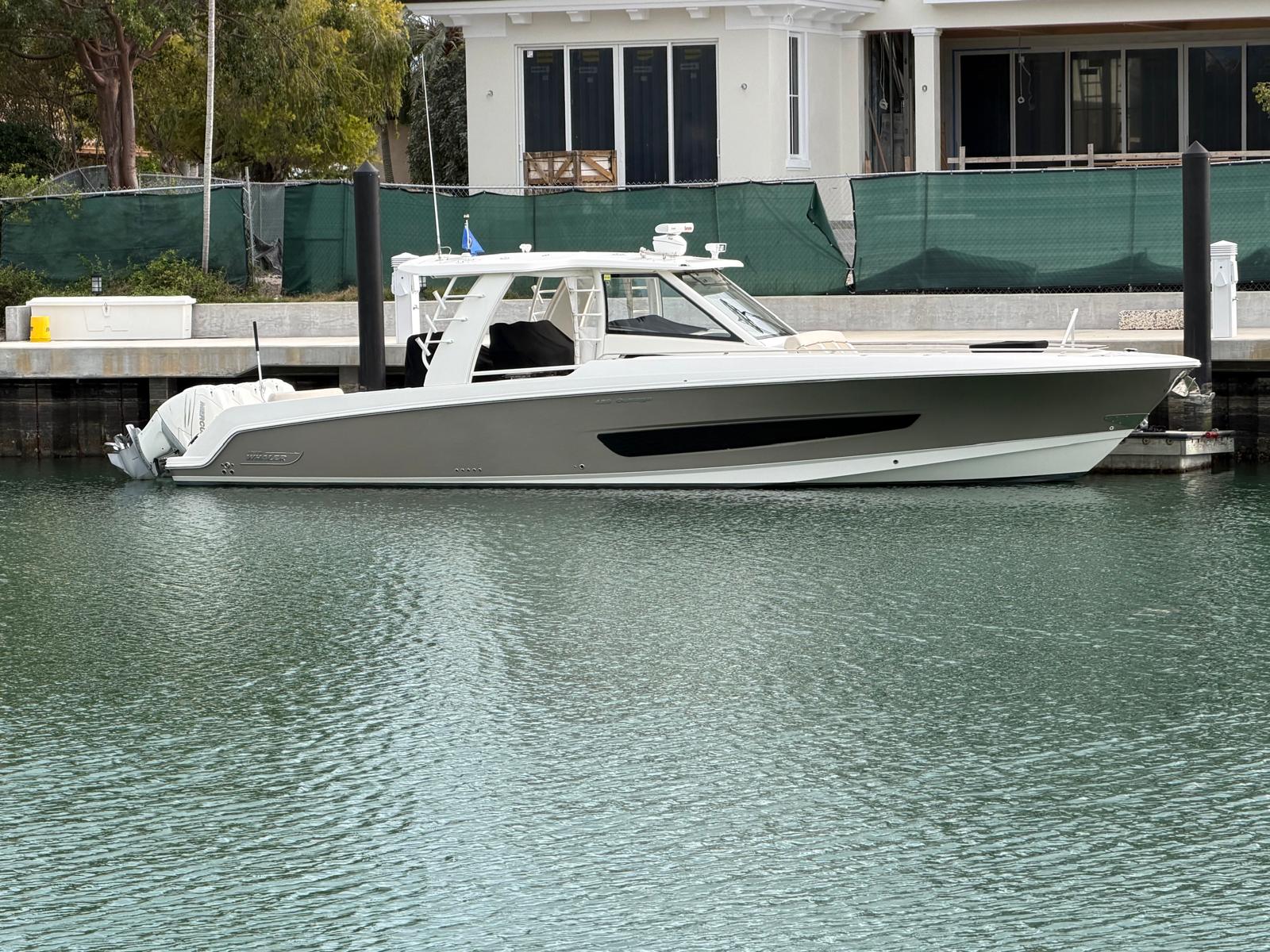 MECHANICAL • Active Engine Trim (Mercury option that automatically adjusts drive trim based on speed) • Active Engine Trim for 2nd station (Mercury option that automatically adjusts drive trim based on speed) (must select a flybridge option) • ACR spotlight (premium) • Advanced battery management system; in cabin electric switches and charging relays with remote paralleling • Air conditioner (helm deck) (18,000 BTU) reverse cycle • Battery trays (7) • Bilge pump – high water bilge pump with alarm (2,000 GPH) • Bilge pumps – automatic (1,100 GPH forward, 2,000 GPH aft) • Bonding system for underwater through hull fittings • Dockside cable TV inlet • Dual 30-amp shore power inlets with battery chargers, isolation transformers and 50' shore power cords • Dual sounder transducer mount area • Electric dual trumpet horn • Electric trim tabs with indicator • Engine fuel / water separators (4) • Freshwater anchor washdown with integrated coiled hose system • Freshwater hot and cold-water system with dockside hookup and tank level indicator integrated into VesselView • Freshwater pull-out hot and cold transom shower • Freshwater system with 60-gallon tank • Freshwater washdown hot and cold retractable hose reel at mid-ship • Fuel tanks – dual 350-gallon aluminum fuel tanks • Generator – low CO gas (7.5 kW) 120 V 60 Hz with fire suppression system, automatic with manual override • Lighting – LED cockpit and machinery space lighting • Manifold plumbing system with individual valve per circuit • Raw-water washdown with retractable hose reel at mid-ship • Stainless steel propellers • Thru hulls – cast bronze thru hulls (below waterline)